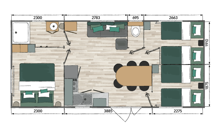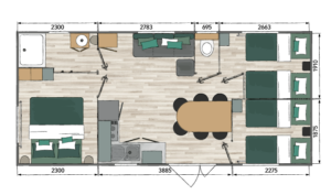 Idéal pour les grandes familles, ce nouveau modéle  de 32 m² dispose d’une cuisine en forme de « L »  ouverte sur un séjour central spacieux et les 3 chambres disposent de portes coulissantes pour gagner en ergonomie. Un modéle conçu pour vous apporter un maximum de confort ,tout en étant en pleine nature .